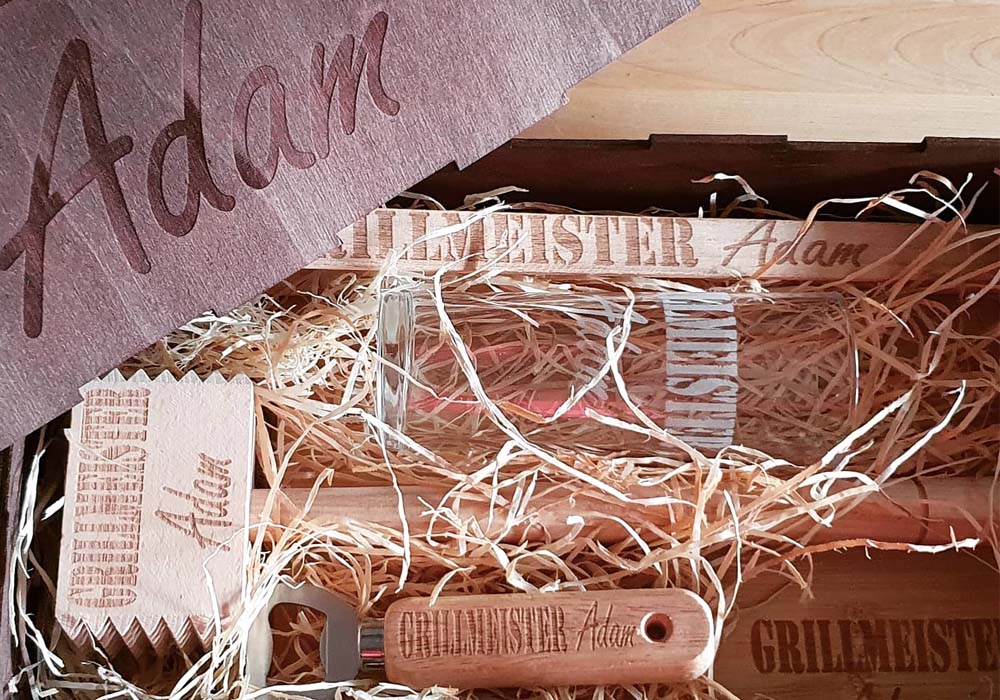 Zudem halte ich eine breite Auswahl an Materialien auf Lager wie Holz-Geschenkkisten in unterschiedlichen Größen, versch. Gläser von der Kölsch-Stange bis zum Sektglas, Holzwerkzeuge und Utensilien und vieles mehr.